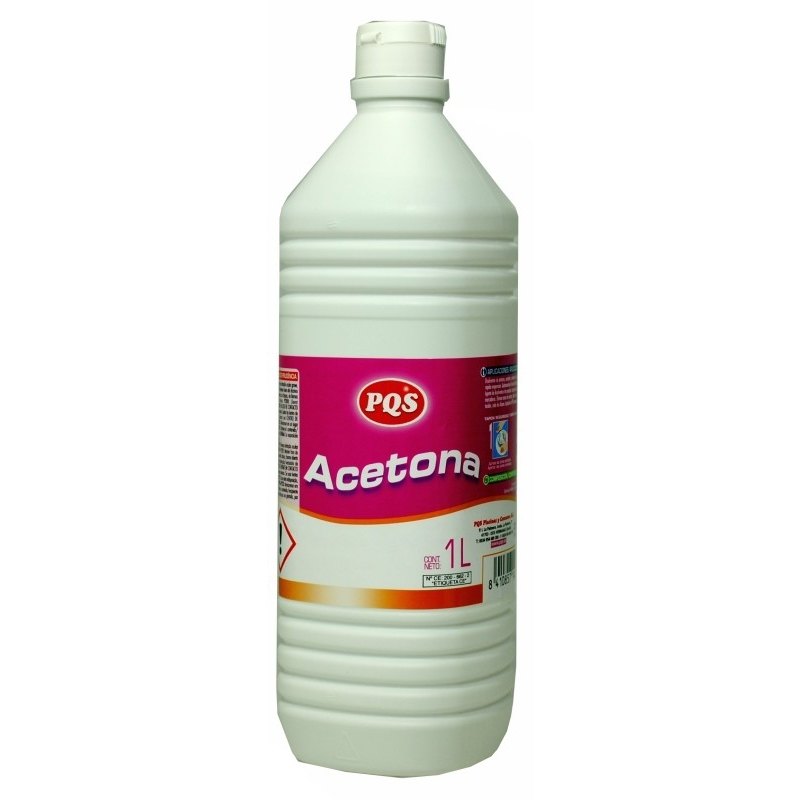 Acetona pura de litro con tapón de seguridad de apertura y cierre de la marca PQS. Limpiador multiusos. Disolvente de pinturas, esmaltes y poliéster. Envase de 1 litro.