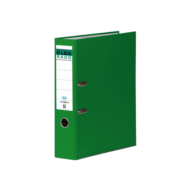 En cartón forrado de plástico de gran resistencia. Etiqueta fija en el lomo. Cantoneras metálicas en borde inferior. Mecanismo de palanca. Sistema rado. Dimensiones: 320x290mm.