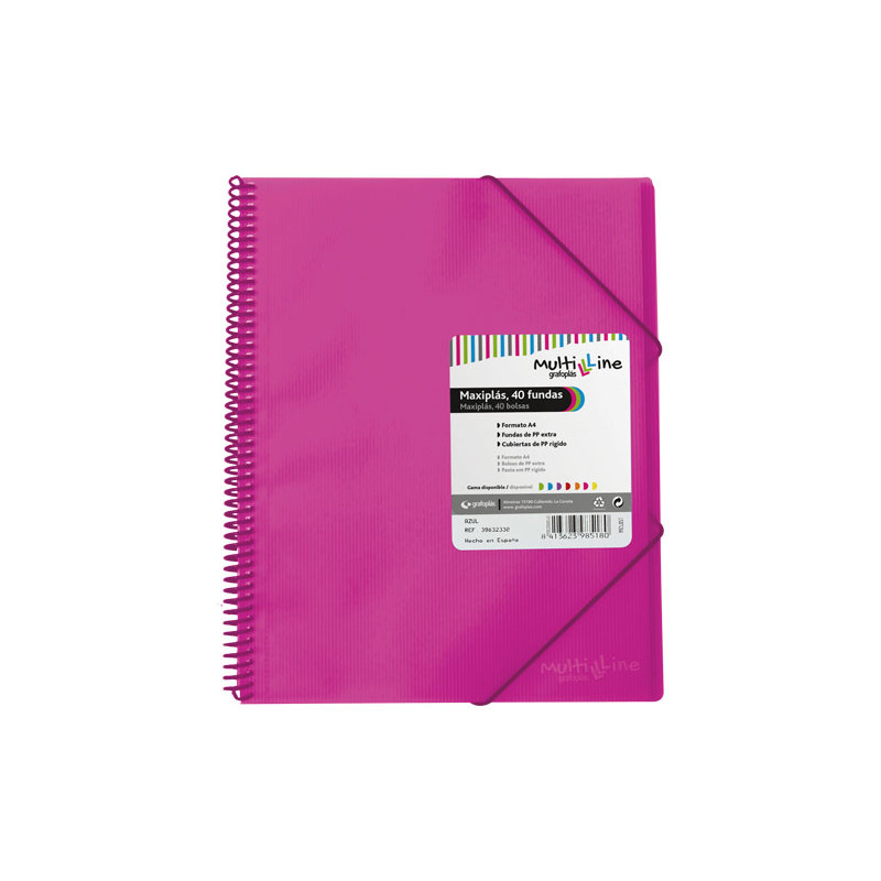 Carpeta de fundas Cubierta en PP rayado vertical Mecanismo de espiral PVC Cierre con goma Contiene fundas de PP extra Medidas: 31,2 x 24 x 3,1 cm.