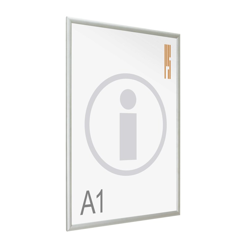 Sistema de presentación con marco abatible de aluminio anodizado en plata mate a inglete, que permite la sustitución del impreso de una manera rápida y cómoda,