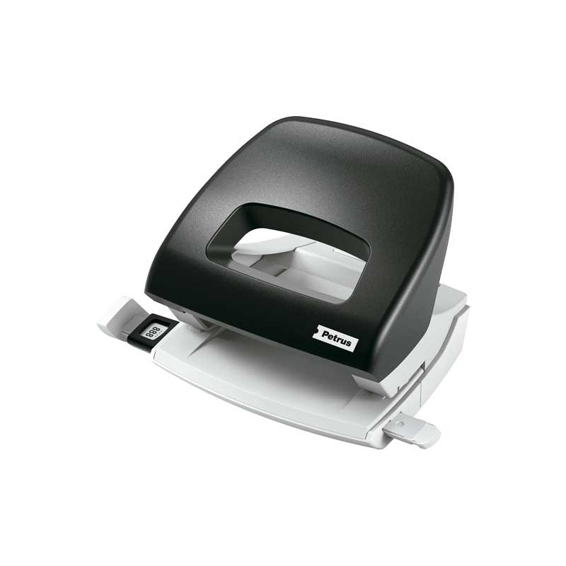Modelo profesional compacto. Práctico y resistente. Zona de sujeción patentada y punzones afiladísimos que reducen el esfuerzo. Perfora hasta 16 hojas de papel (80 g/m²). Con dos taladros. Cubeta con bisagra fácil de vaciar.